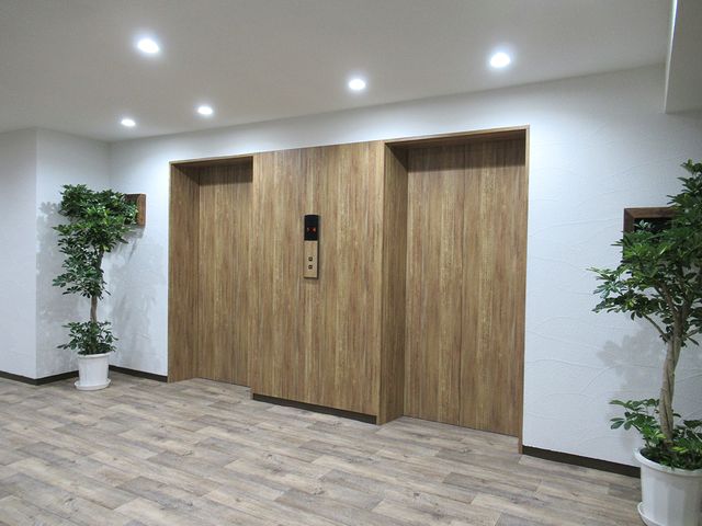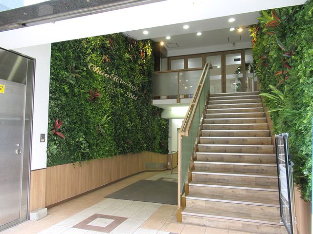 エントランス・共用部リニューアル済み。木目調と緑がいっぱいでとても良い雰囲気です。